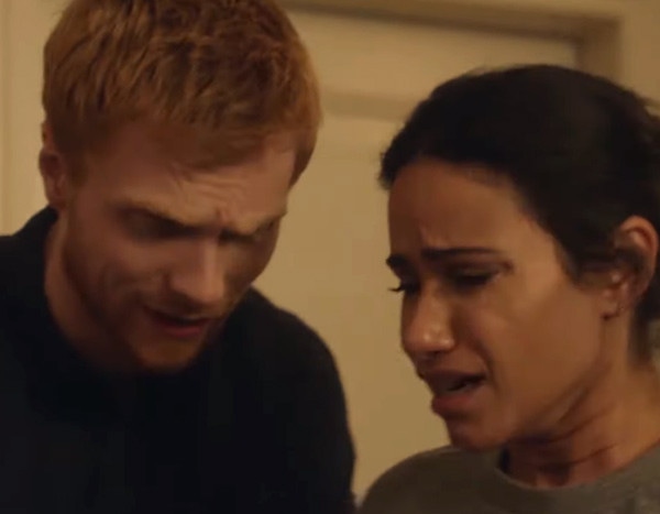In a sneak peek at Harry & Meghan: Becoming Royal, viewers watch Meghan (played by Tiffany Marie Smith) and Prince Harry (Charlie Field) have a difficult conversation with Thomas (Bruce Blain).