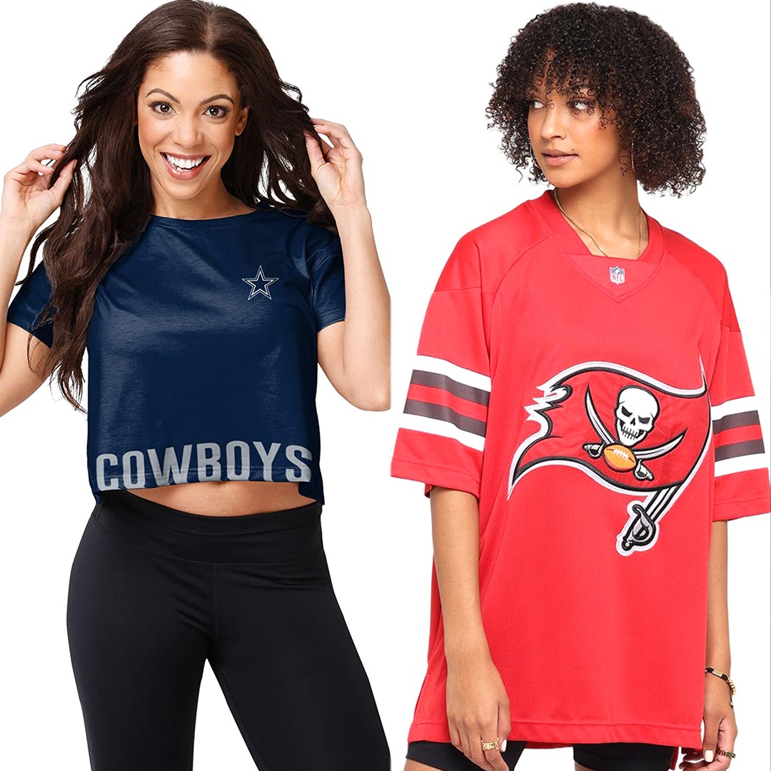 Of course, you can never go wrong wearing a jersey. However, if you want to switch things up with your fashion, we have found some stylish options for your next tailgate from Fanatics, Etsy, Baublebar, Amazon, American Eagle, Culture Kings, Junk Food Clothing, and more.