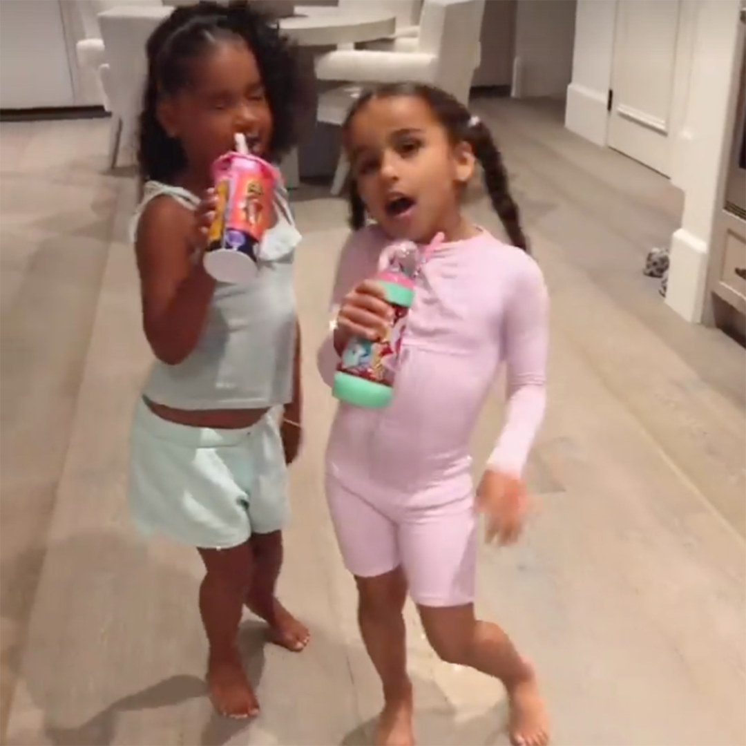 The toddlers—dressed in monochrome pastel pajamas— put on an adorable performance for the Keeping Up With the Kardashians alum, dancing and singing along to the classic ’90s song “Barbie Girl” by Aqua, as well as the inescapable “We Don’t Talk About Bruno” from Disney‘s Encanto.