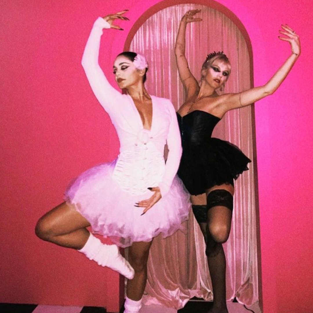 In party pics shared to Instagram on Oct. 24, Vanessa transformed into the ballet’s elegant White Swan Queen, donning a white fluffy tutu, cropped cardigan, white leg warmers and feathered headpiece. Her BFF GG MaGree posed with her as the evil Black Swan, wearing a black strapless corset, styled with a tutu, lacy over-the-knee stockings and black spiked tiara. Both dancers also added the dramatic winged eye make-up made famous by the movie.