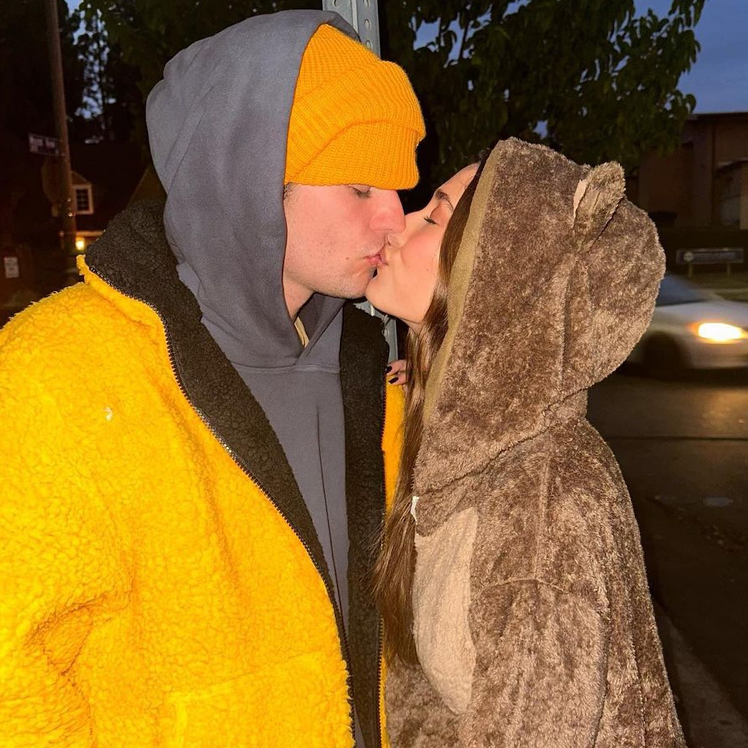 The couple cuddle up for a kiss in a new Instagram pic posted by the “Ghost” singer on Nov. 5. In the snap, Hailey is seen wearing a teddy-bear onesie, complete with a hood with ears as she plants a smooch on her husband who is bundled up in a yellow fleece jacket, matching beanie and grey hoodie.