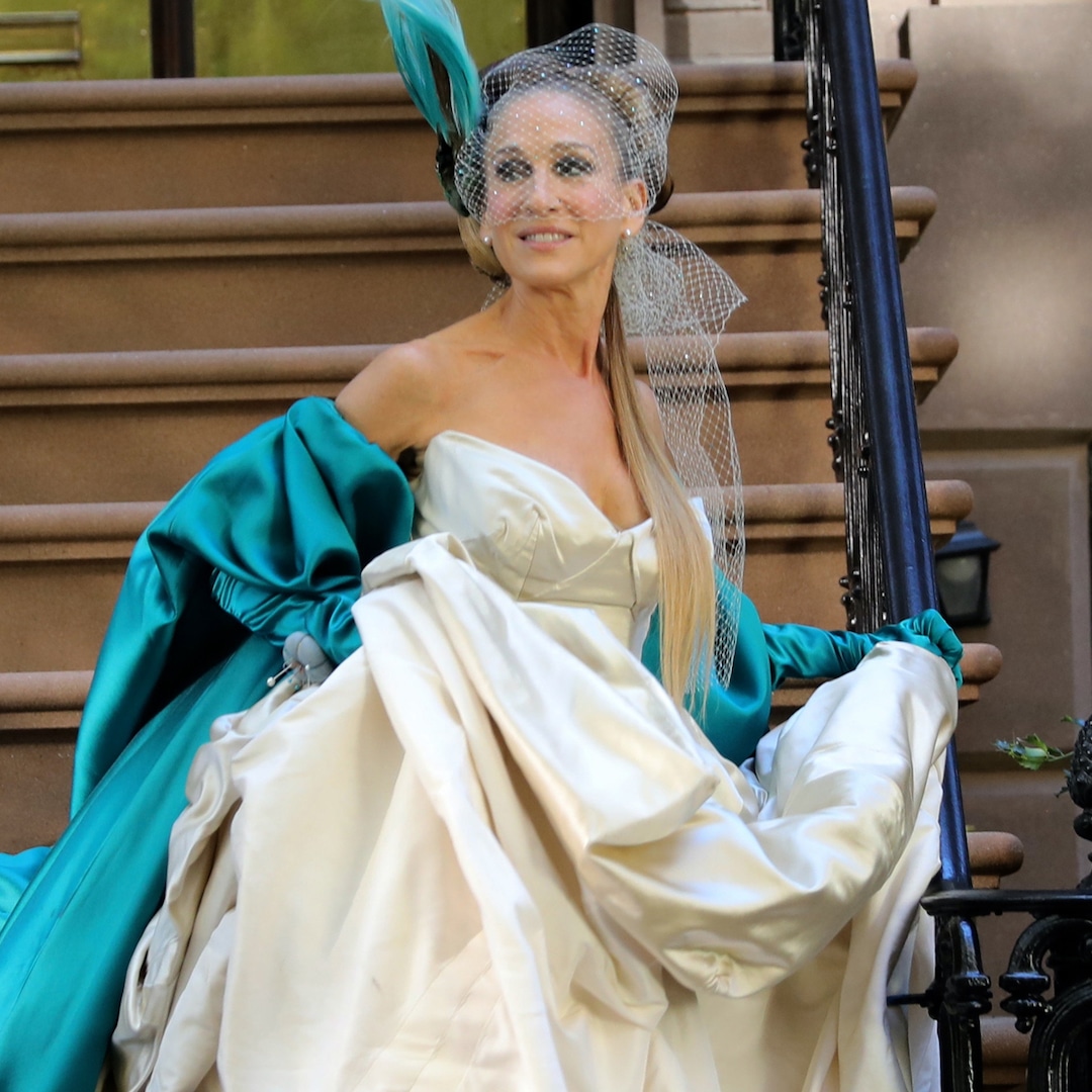In a Nov. 3 photo from the set of the second season of And Just Like That…, Sarah Jessica Parker is seen wearing Carrie Bradshaw’s classic Vivienne Westwood dress from her wedding to Mr. Big (Chris Noth).