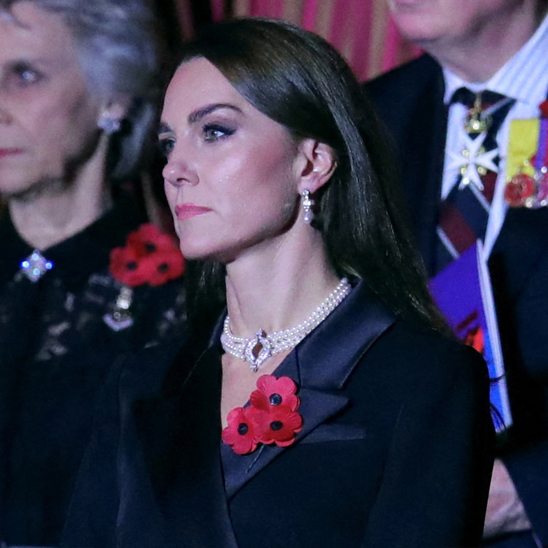 While attending the Festival of Remembrance event at London’s Royal Albert Hall on Nov. 12, alongside her husband Prince William and King Charles, the Princess of Wales wore two special jewelry pieces that once belonged to her late grandmother-in-law. Accessorizing her all-black ensemble by Self-Portrait, the 40-year-old donned the Queen’s Bahrain pearl drop earrings and a four-strand pearl choker necklace with diamond piece in the center.